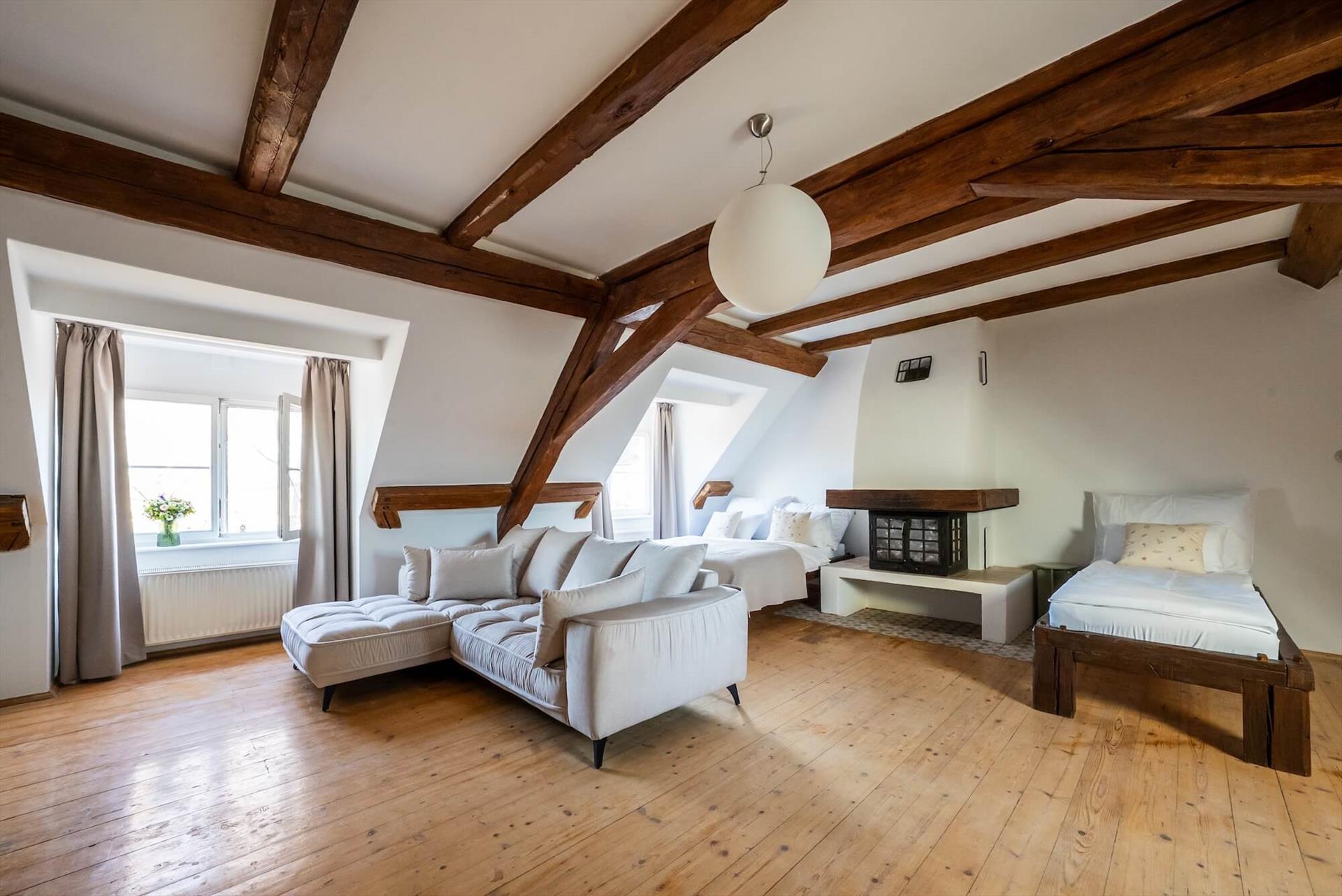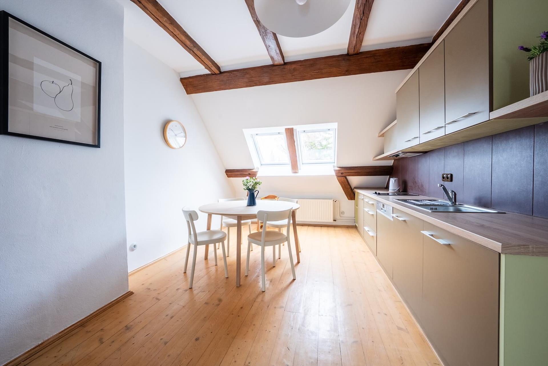 Apartmán D1 se dvěma ložnicemi nabízí klid a dostatek prostoru v podkroví s vlastním vstupem. Hlavní obytná část je průchozí a zároveň slouží jako ložnice s manželskou postelí a jednolůžkem. K dispozici je plně vybavená kuchyň s jídelním koutem, za kterou se nachází samostatná ložnice s manželskou postelí. Koupelna s vanou, sprchovým koutem a pračkou poskytují praktické a pohodlné zázemí pro rodinný pobyt.
