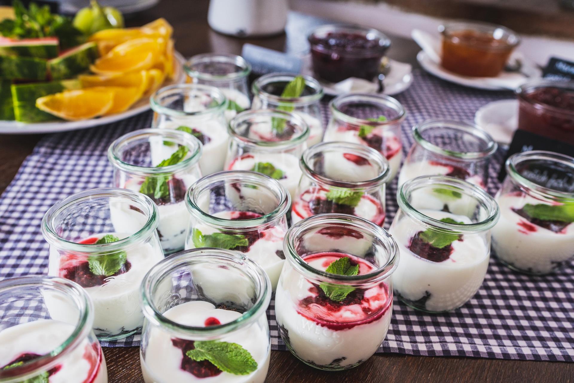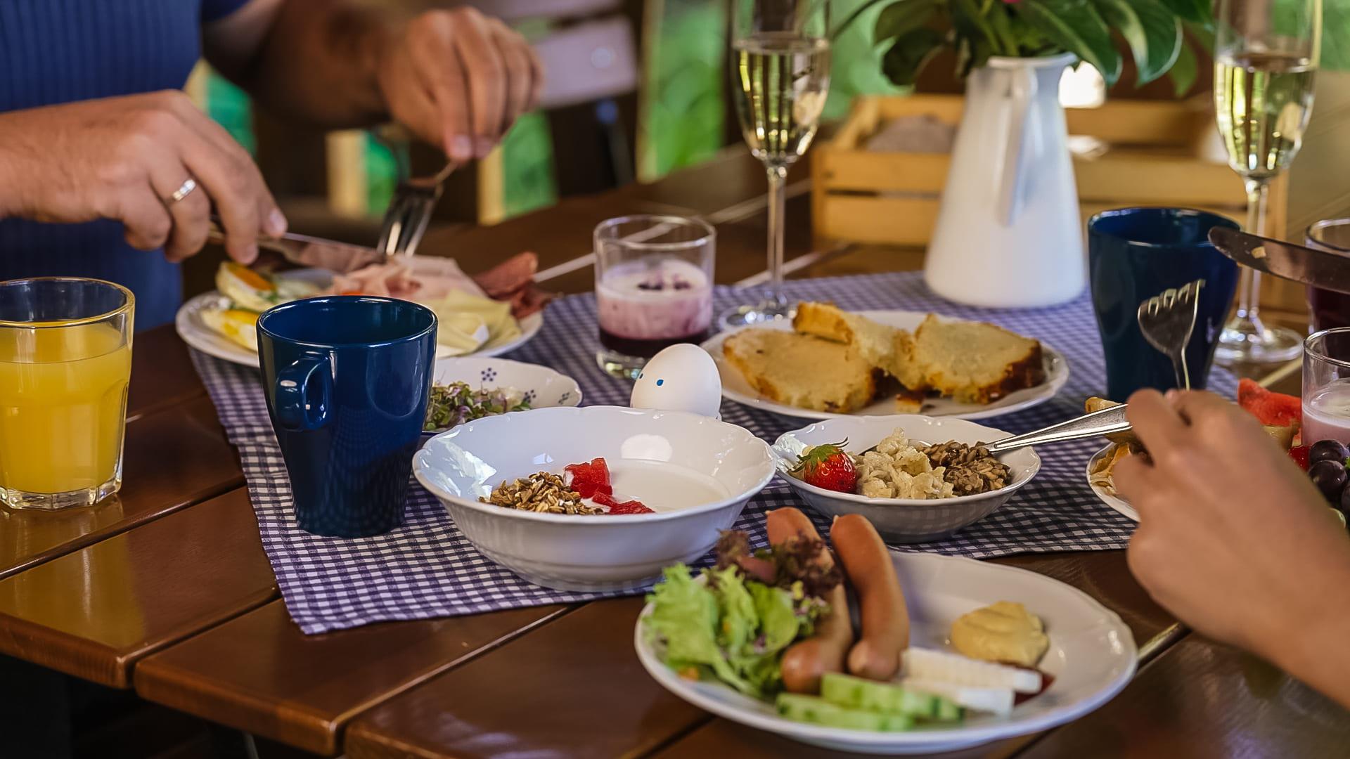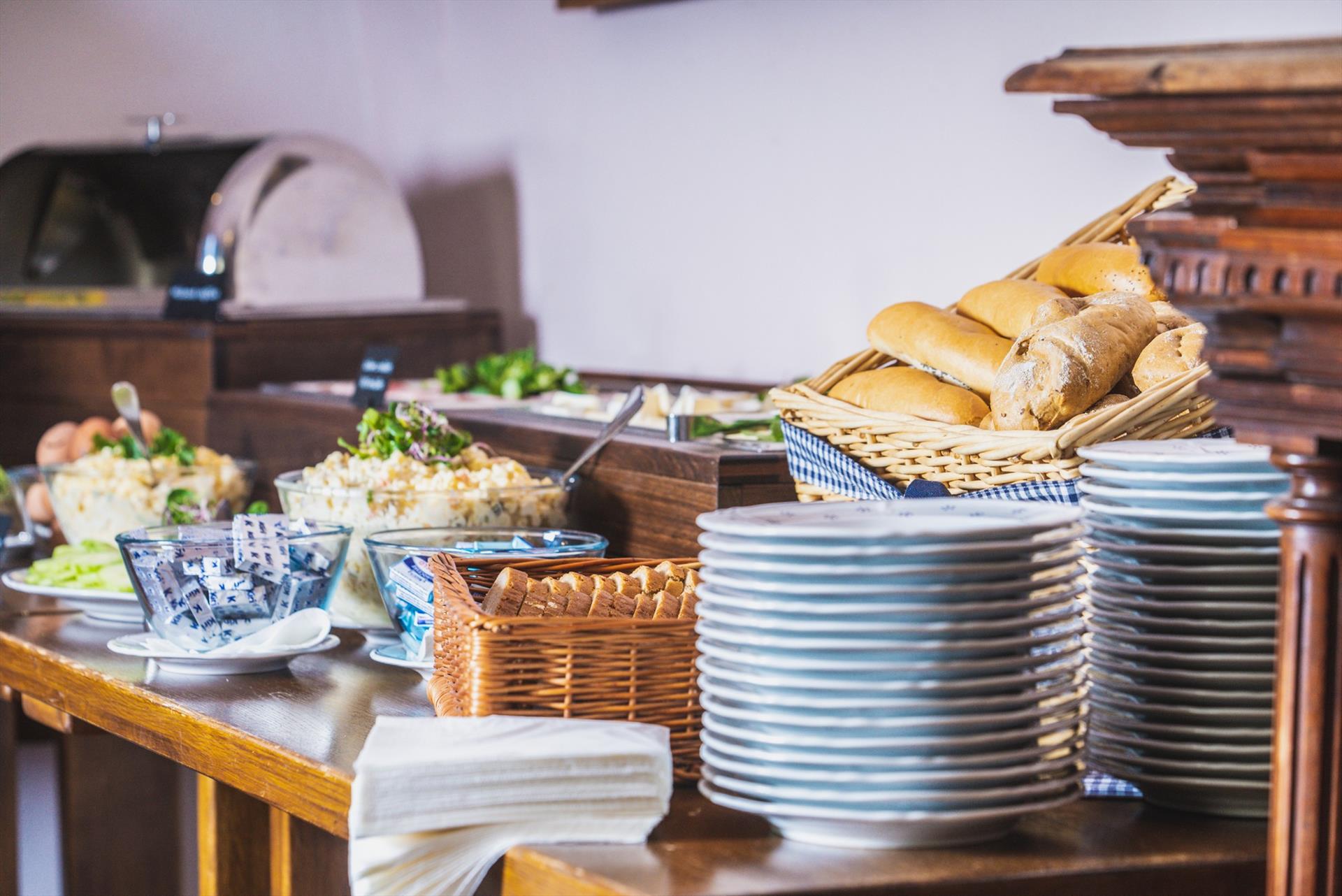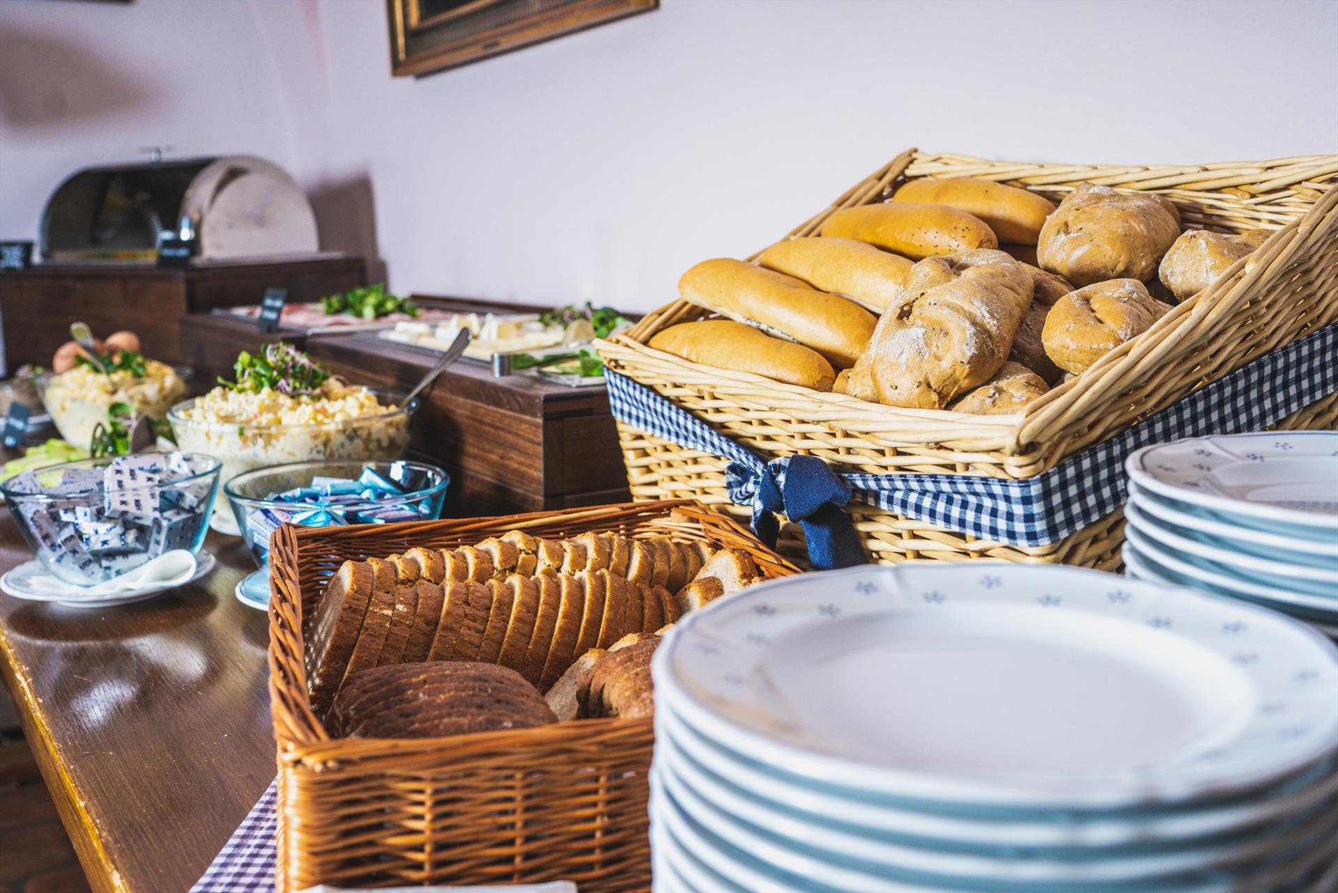 Das Abendessen für Hotelgäste und andere Gäste servieren wir in Form eines Buffets, das jeden Tag anders gestaltet ist. Unsere Gäste lieben unsere Buffets einfach. Zur Auswahl stehen immer 2 Suppen, 5 Vorspeisen, 4 Hauptgerichte und 3 Desserts. Alle Gerichte werden aus frischen Zutaten zubereitet, und ein Großteil davon stammt von unserem Bauernhof – Brühen und cremige Suppen, frische Salate, Tartar aus unserem Bio-Rindfleisch, marinierte Rote Bete und Karotten aus dem Garten sowie Fischsalat. Hausgemacht sind außerdem Burger, Rindfleisch in Karotten, Schnitzel, Bolognese-Nudeln, Kartoffelpuffer und Spieße. Die Bäuchlein der Kinder haben wir mit Heidelbeerknödeln, einer Schokoladenfontäne, viel Obst oder Brötchen mit Vanillecreme erobert.