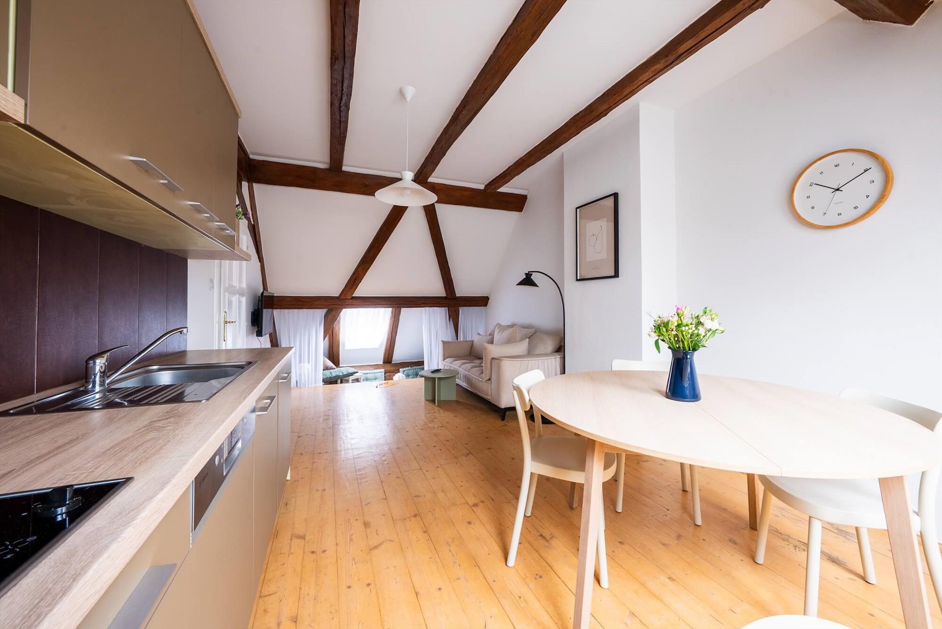 Apartment D1 with two bedrooms offers peace and plenty of space in the attic with a private entrance. The main living area is open-plan and also serves as a bedroom with a double bed and a single bed. A fully equipped kitchen with a dining area is available, behind which there is a separate bedroom with a double bed. The bathroom with a bathtub, shower, and washing machine provides practical and comfortable facilities for a family stay.