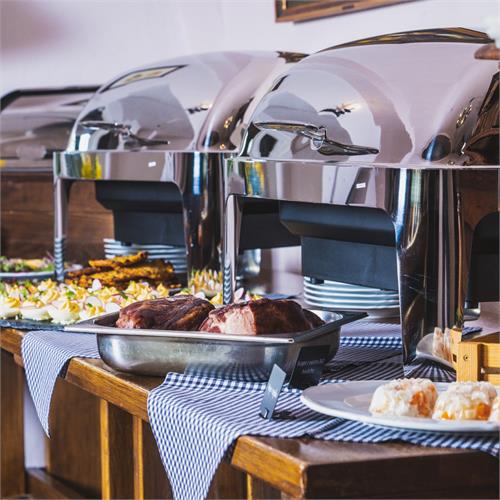 Dinner for hotel guests and guests are served in the form of a buffet, which is different every day. Guests simply love our buffets. We always have a choice of 2 soups, 5 starters, 4 main courses and 3 desserts. All dishes are made with fresh ingredients and much of it comes from our farm - broths and thick creams, fresh salads, tartare made from our organic beef, marinated beets and carrots from the garden and fish salad. The burgers, beef in carrots, steaks, bolognese pasta, potato chips and skewers are also homemade. We won the kids' tummies with blueberry dumplings, chocolate fountain, lots of fruit or buns with vanilla cream. At our buffet you will always find a myriad of vegetarian dishes, without meat we have 1 soup , 3 starters and 1 main dish. For a sweet ending, try our famous desserts.